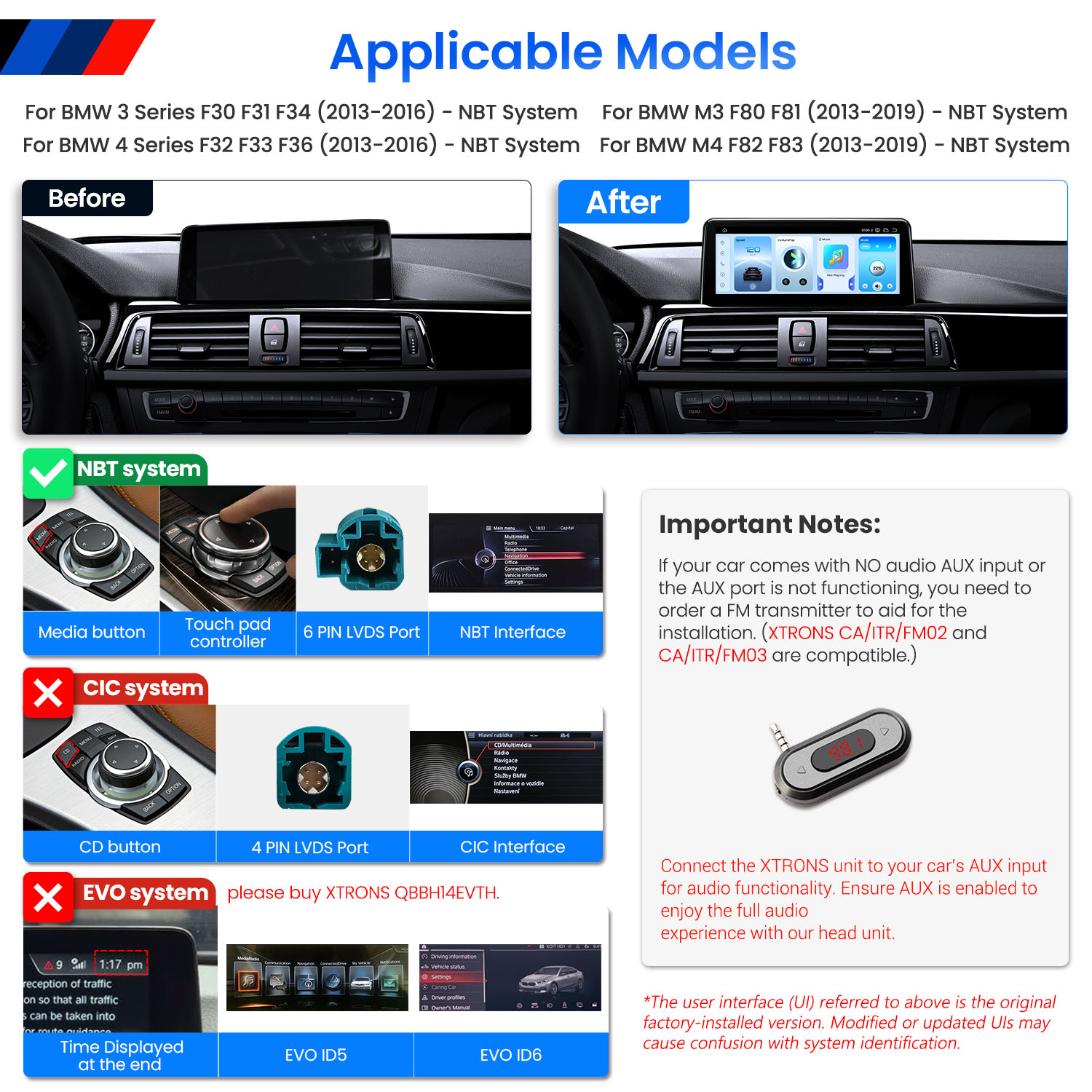 1. This unit ONLY works with the original BMW NBT system. A NBT system car radio usually comes with Media button, touch pad controller, a 6-pin LVDS port and a BMW NBT Interface.